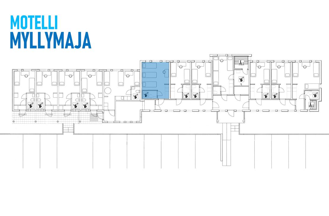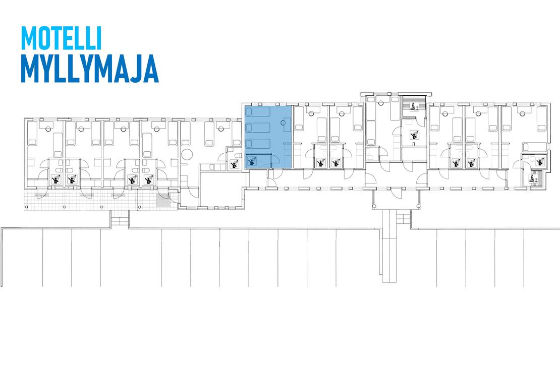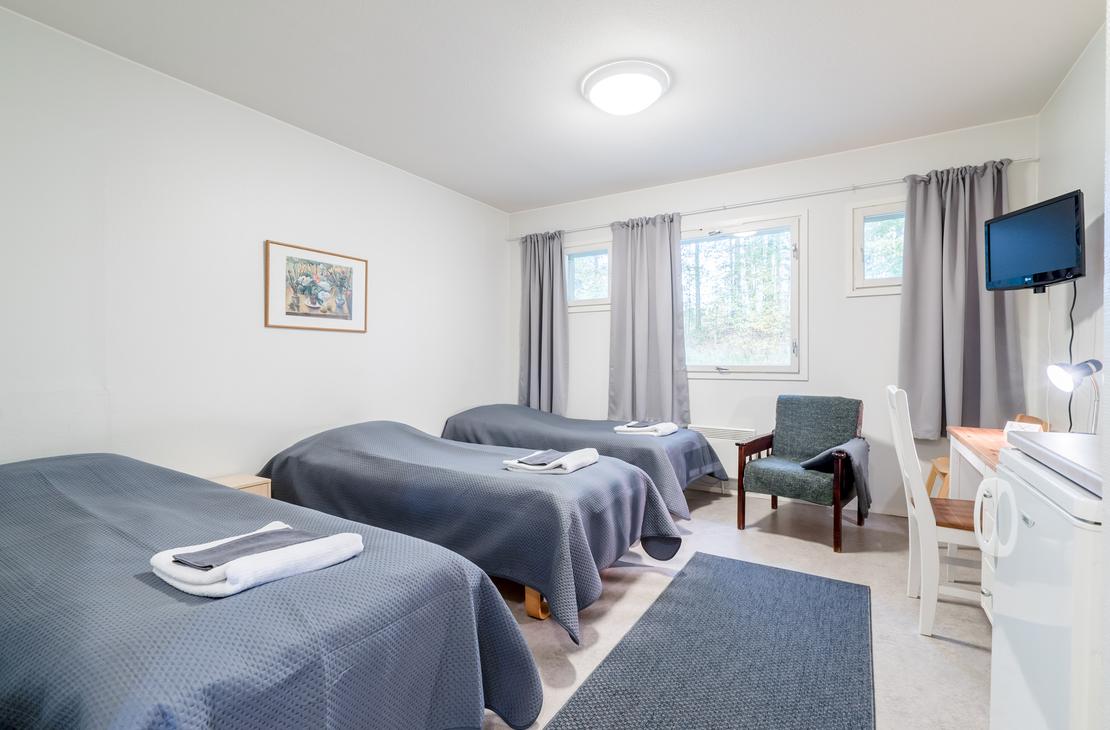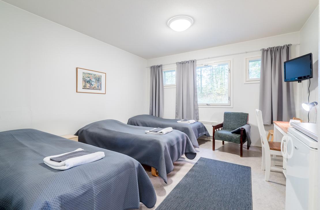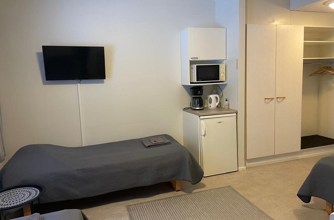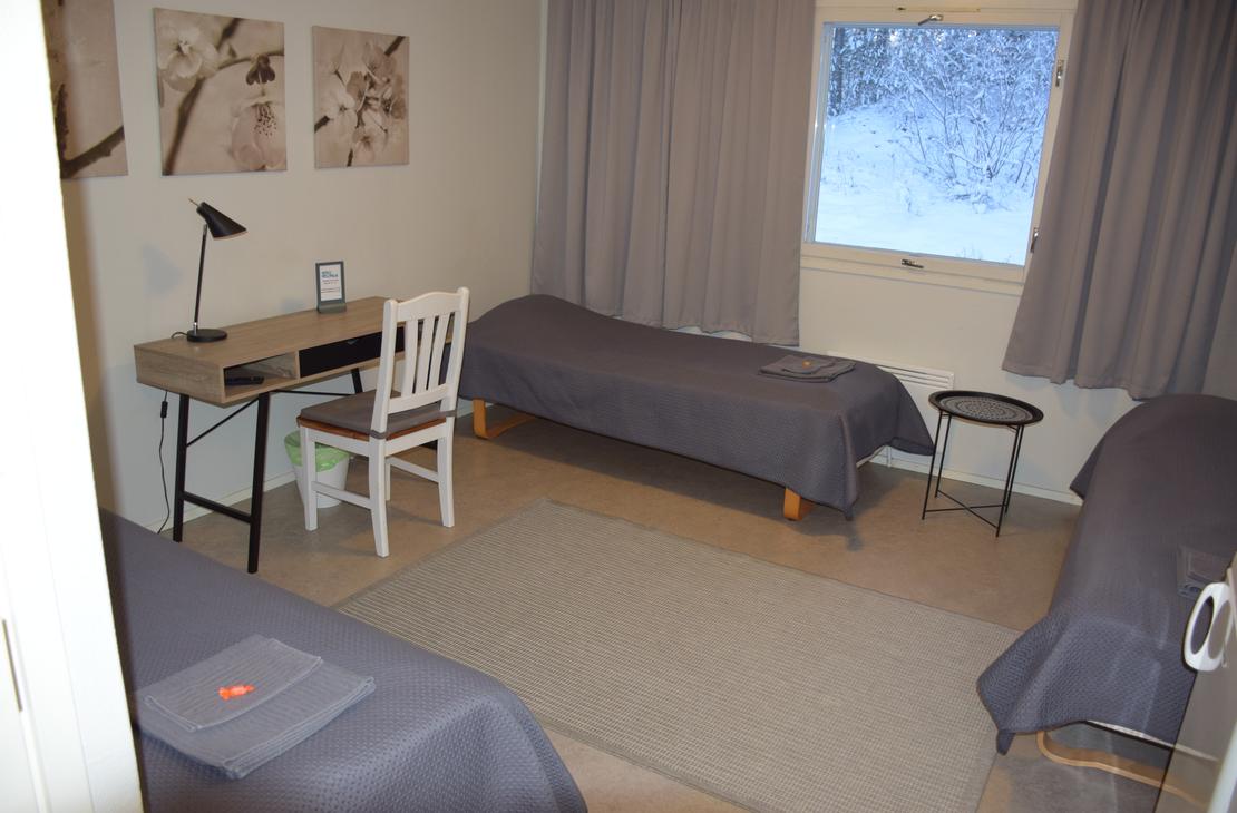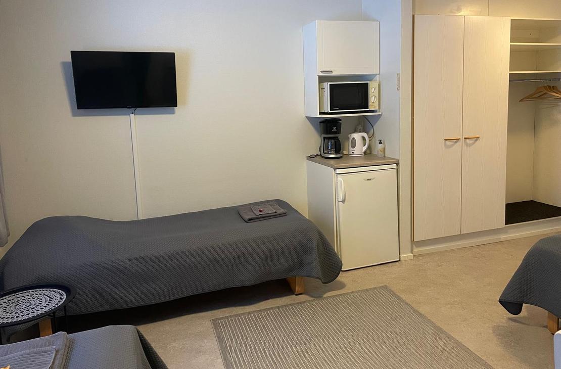 3hh, sisäänkäynti yhdyskäytävältä, oma wc/suihkutila. Huoneessa 3 erillisvuodetta, kirjoituspöytä, TV, mikroaaltouuni ja jääkaappi. Ikkunoissa pimennysverhot. Aamupala, liinavaatteet, loppusiivous sekä lämmityspaikka autolle kuuluu huonehintaan.